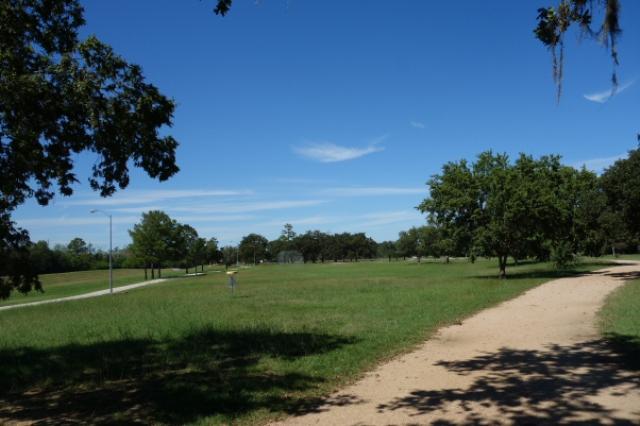 This park has an 18-hole disc golf course. You can also see the gravel park trail (R) running parallel to the concrete paved White Oak Bayou Trail (L).